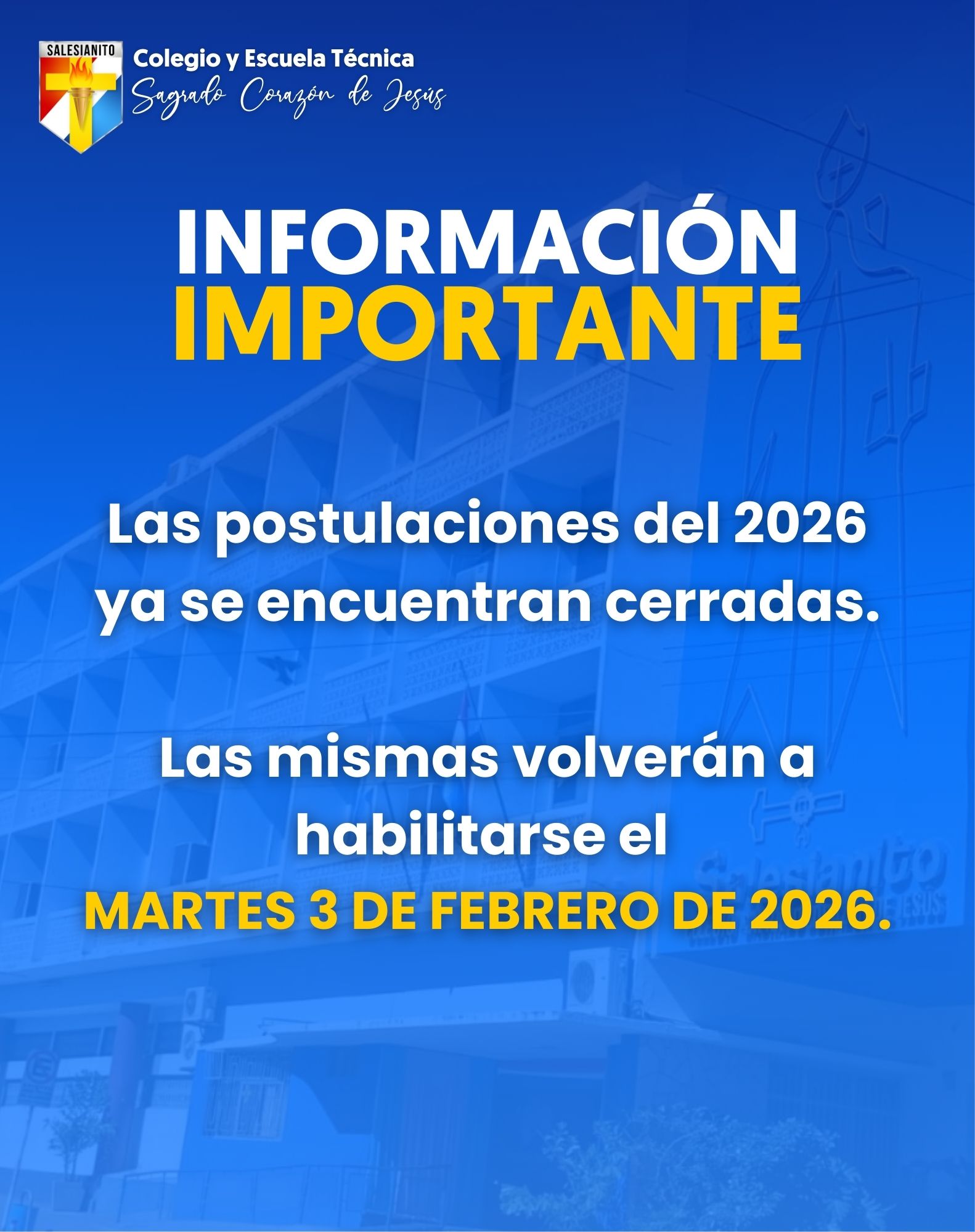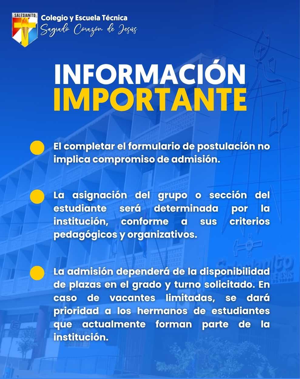 Este es el primer paso para que sean parte de la Familia del Salesianito. Aquí podrán encontrar todos los requisitos y formularios para la postulación 2026.